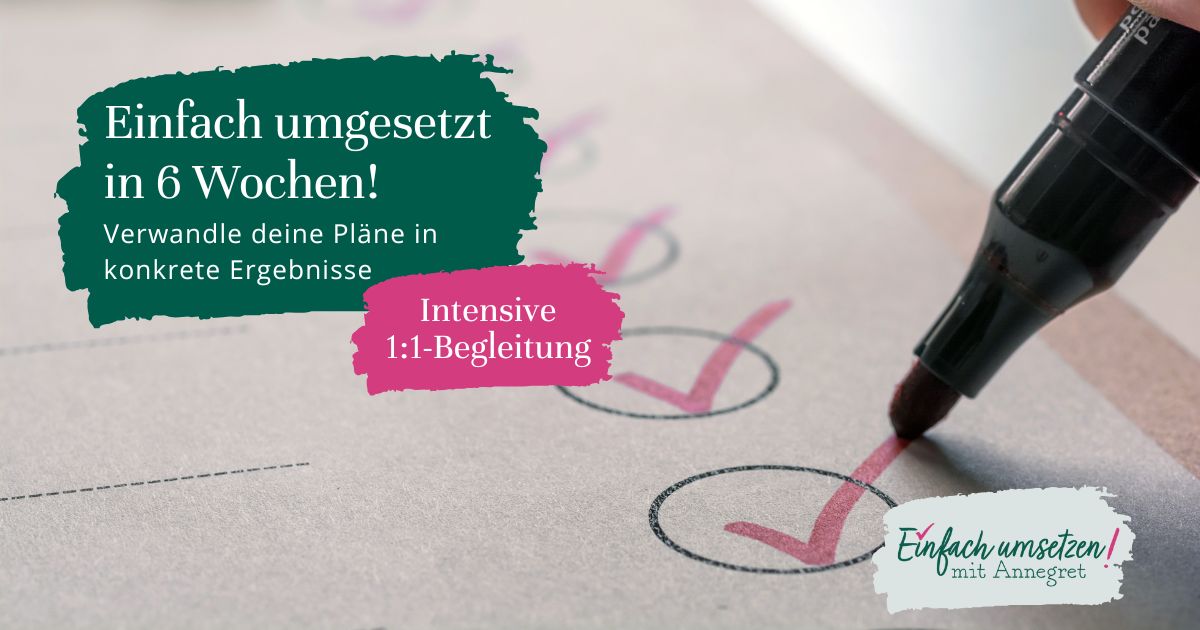 Du hast ein konkretes Projekt und brauchst persönliche Unterstützung? Du möchtest individuell nach deinem Zeitplan begleitet werden? Dann ist „Einfach umgesetzt in 6 Wochen“ das Richtige für dich.
